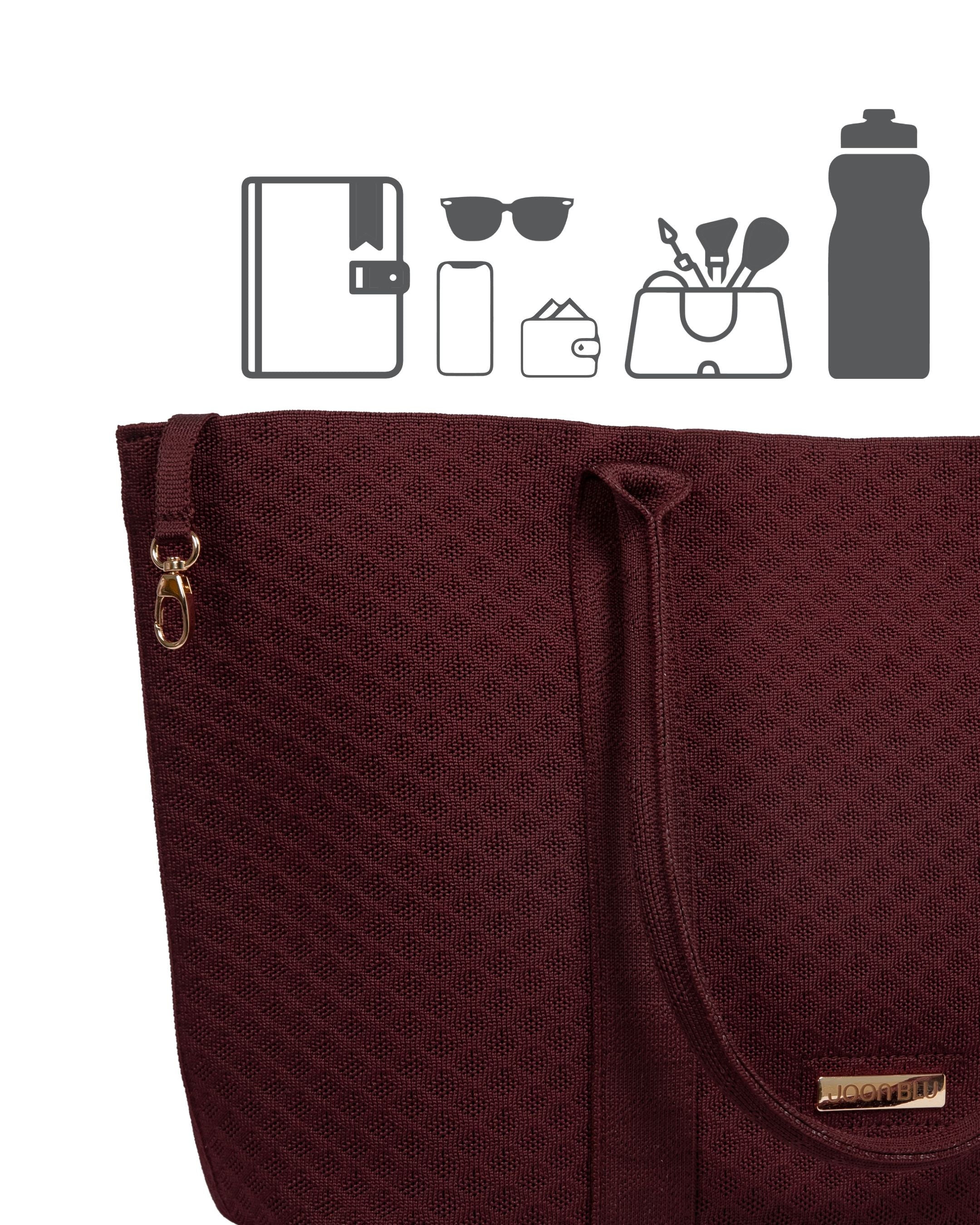 The Merlot pattern in maroon makes it a sophisticated and versatile tote bag designed to elevate your everyday style with its rich merlot maroon hue.