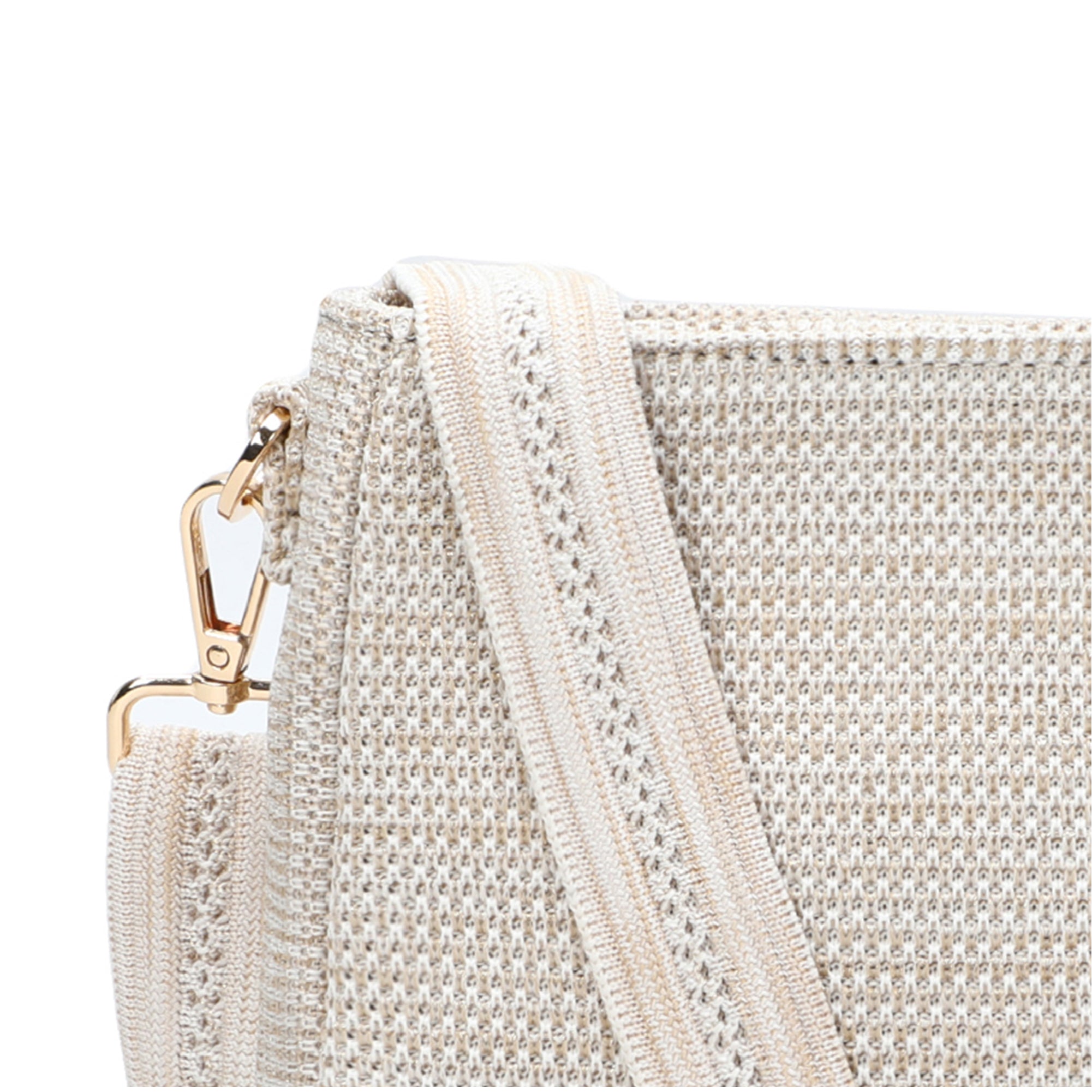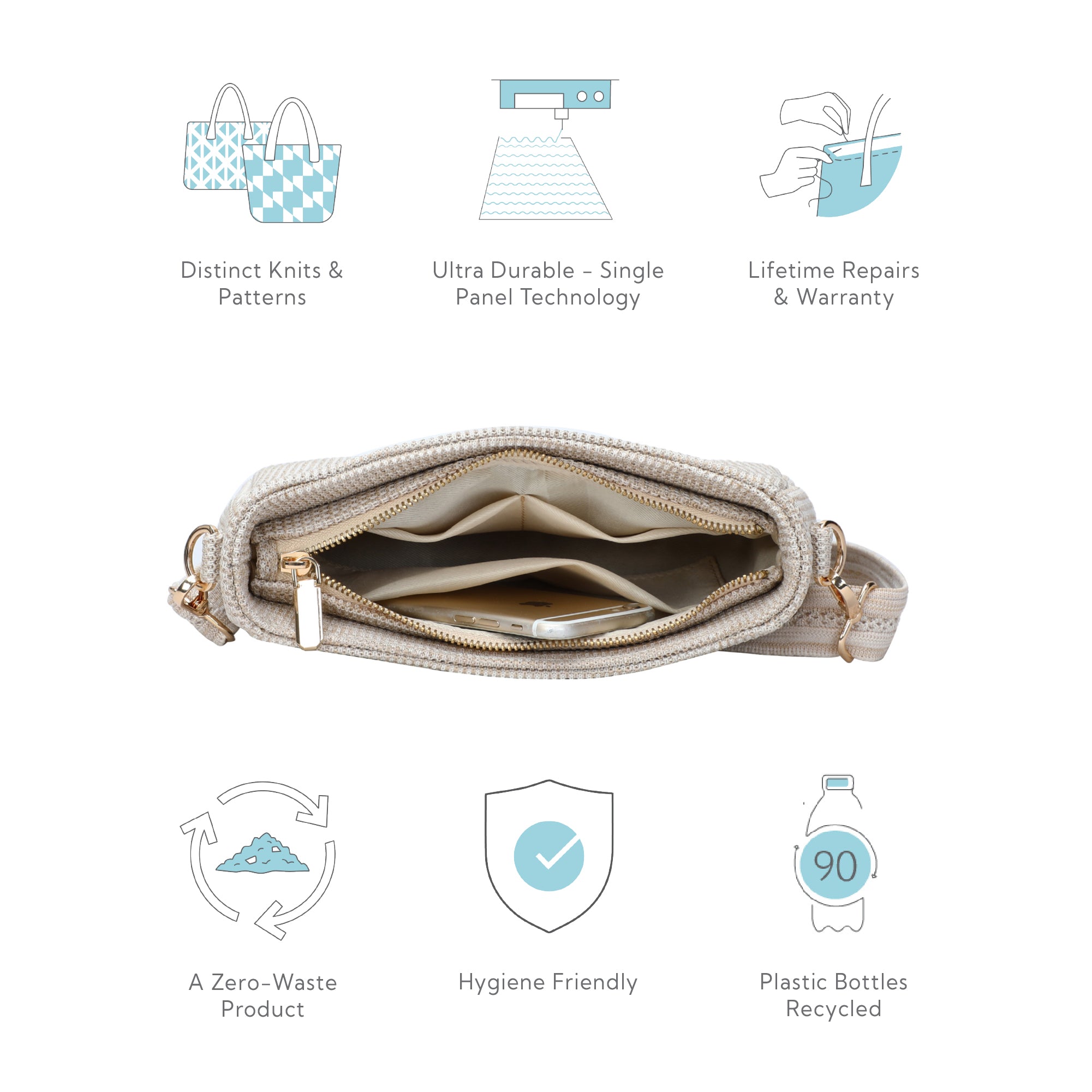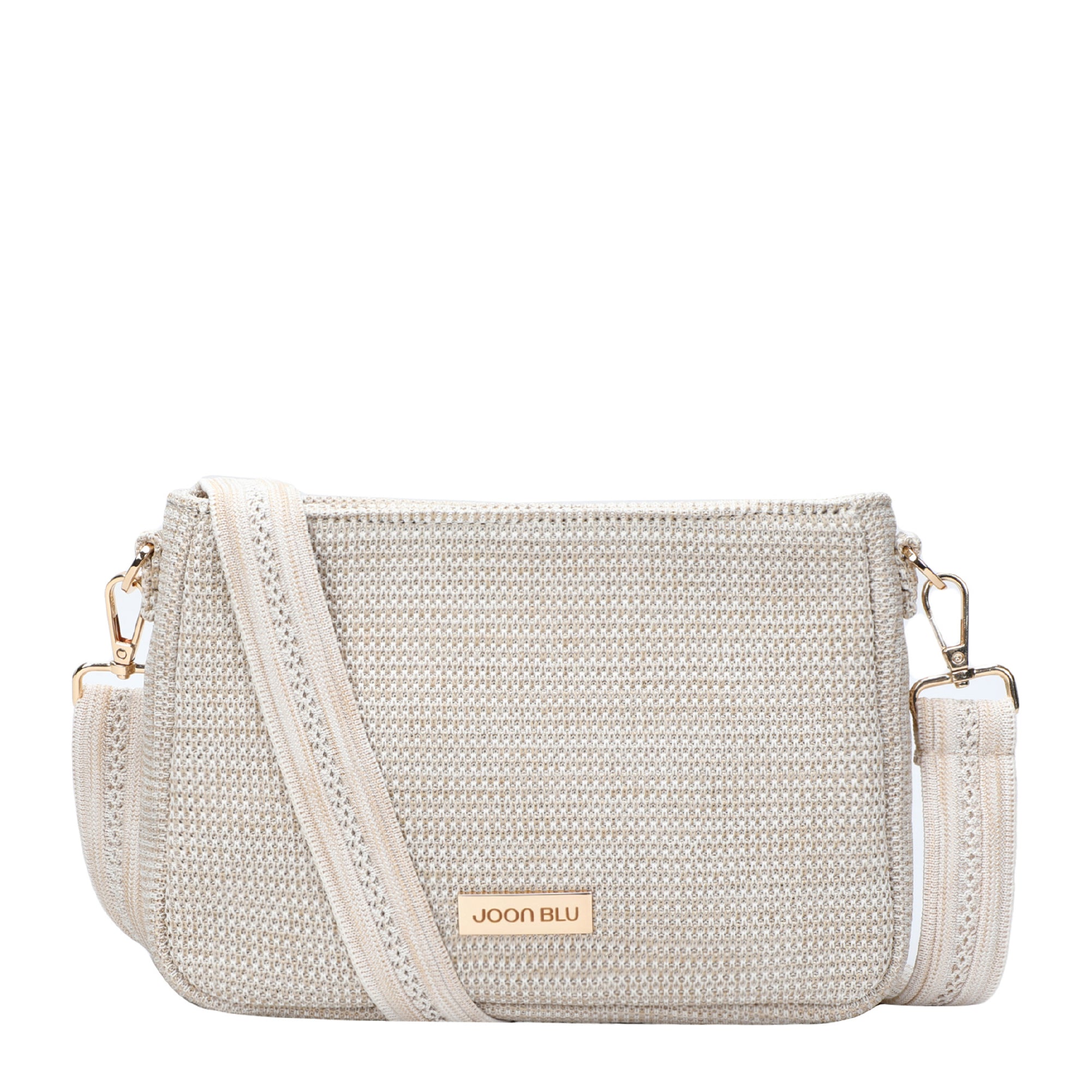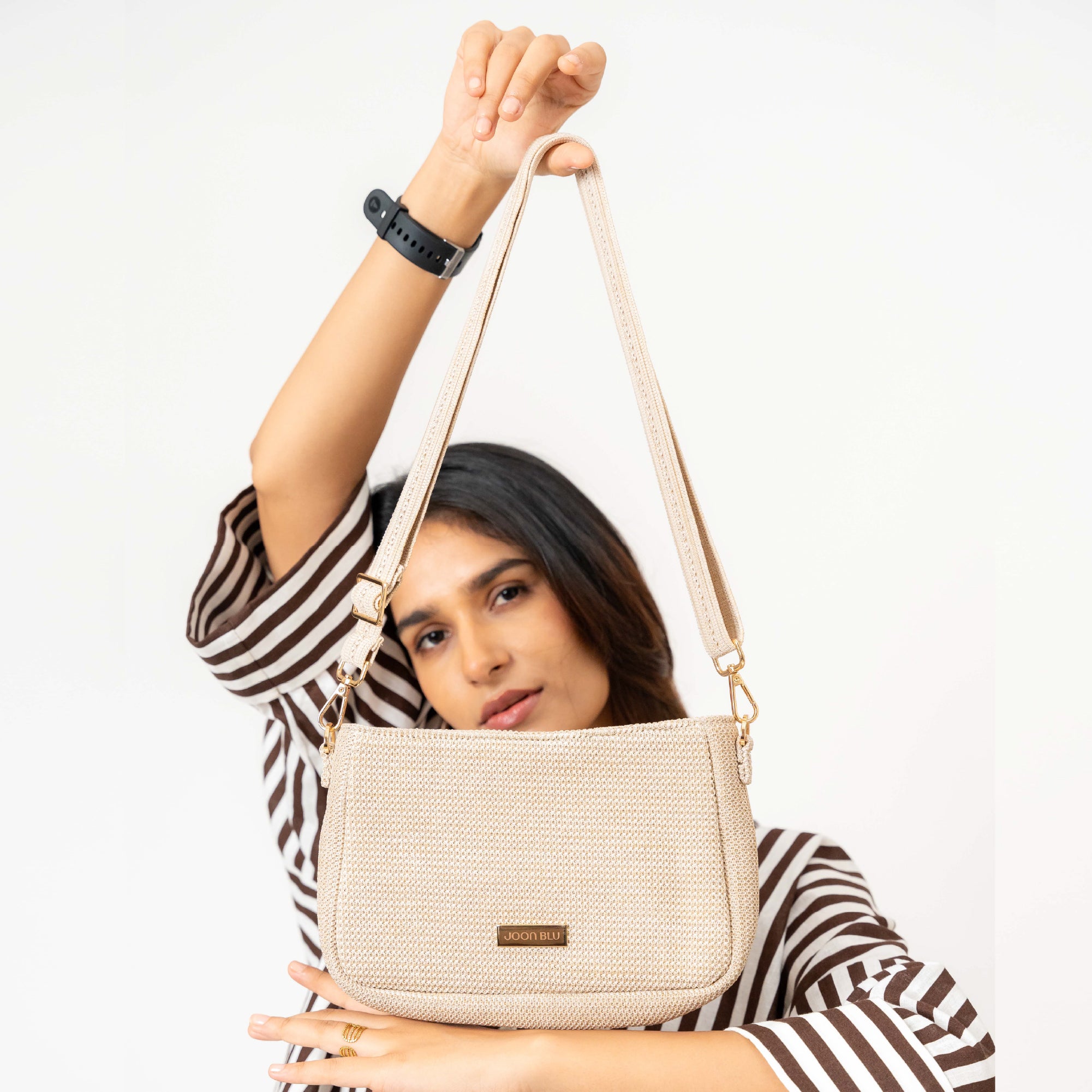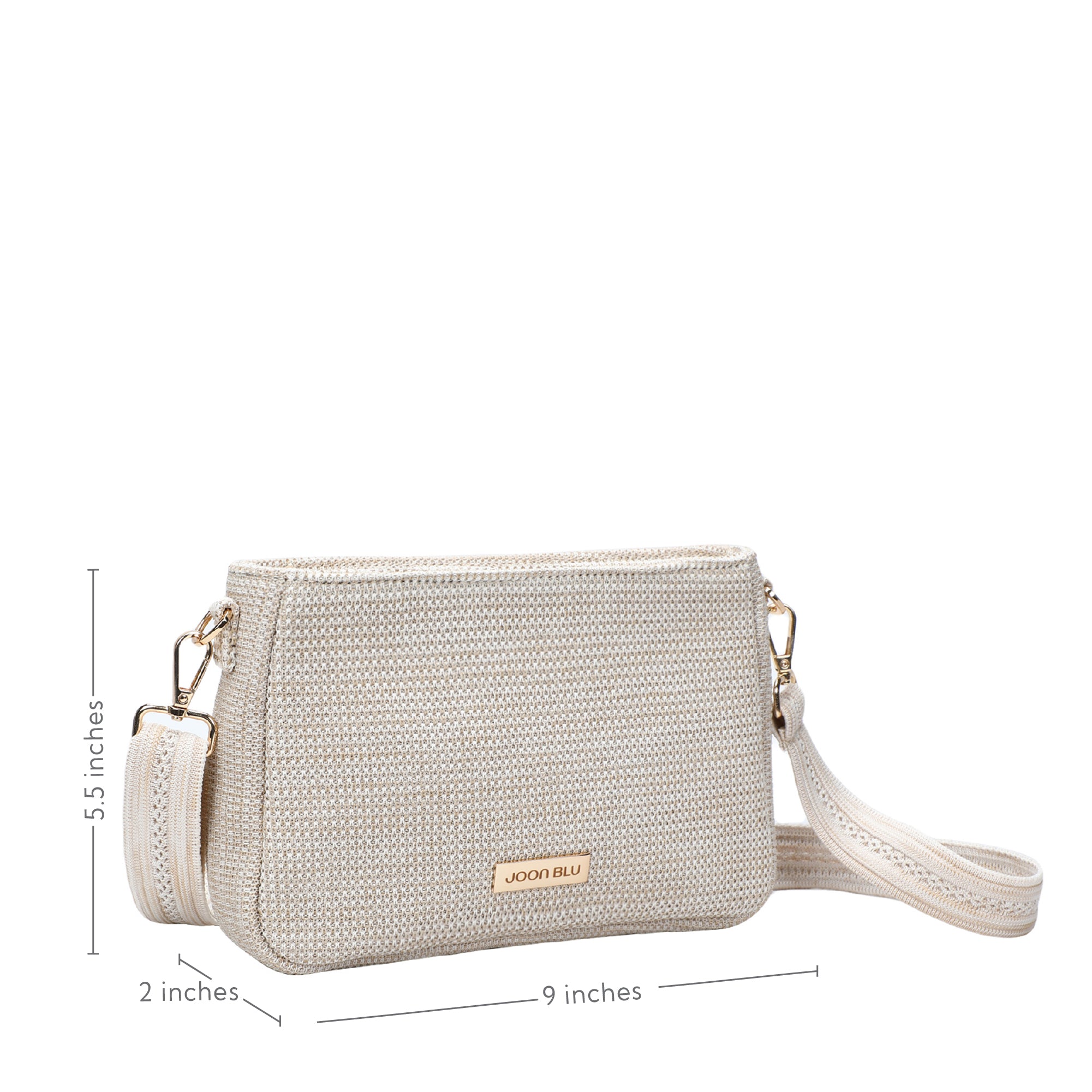 This Melange knit mini sling bag with the Mono-Inweave belt in beige & gold makes it a blingy fusion of colours that adds sophistication to any outfit.