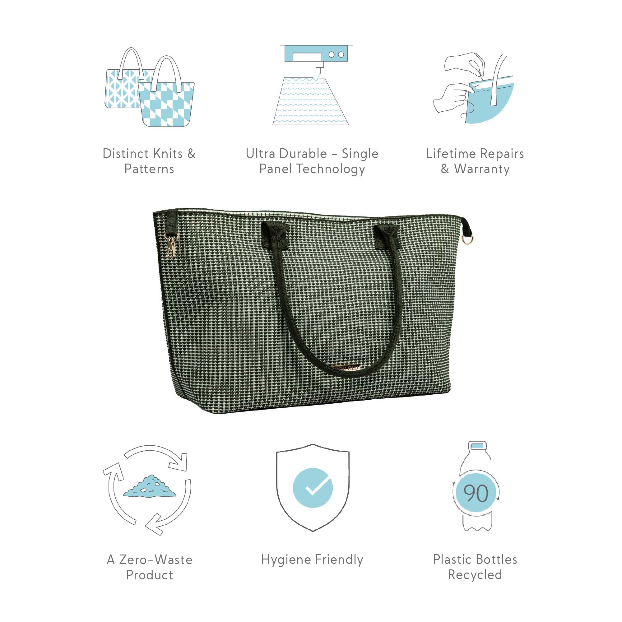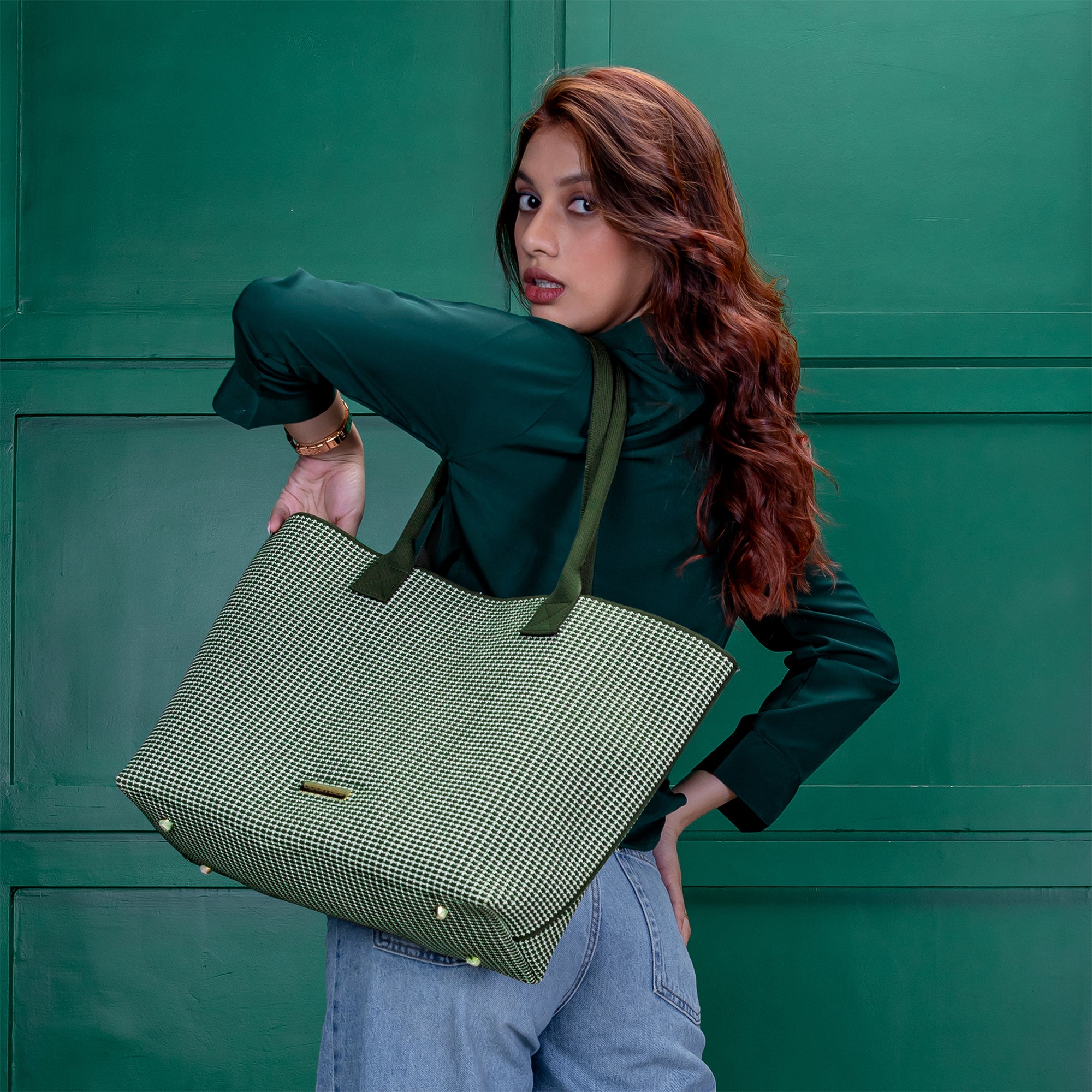 The checkered Tessellate pattern in olive & beige makes it the perfect accessory for those who value simplicity, functionality, and versatility in their everyday carry-all.