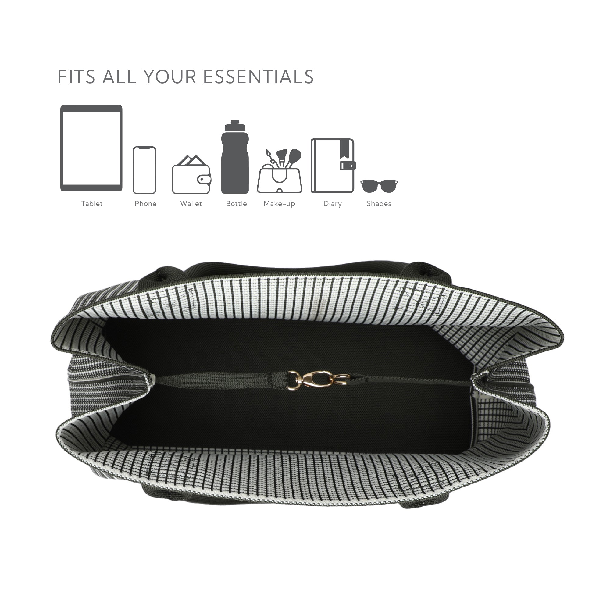 Fit your entire day into ONE bag! This oversized women's tote bag surprisingly holds upto 15 liters of capacity. The open structure of the bag lets you haul everything you need in one place without hindrance & secure it with a hook & eye closure. Ideal for trips, college, shopping, and daily use, it adapts to your needs while maintaining a chic appearance.