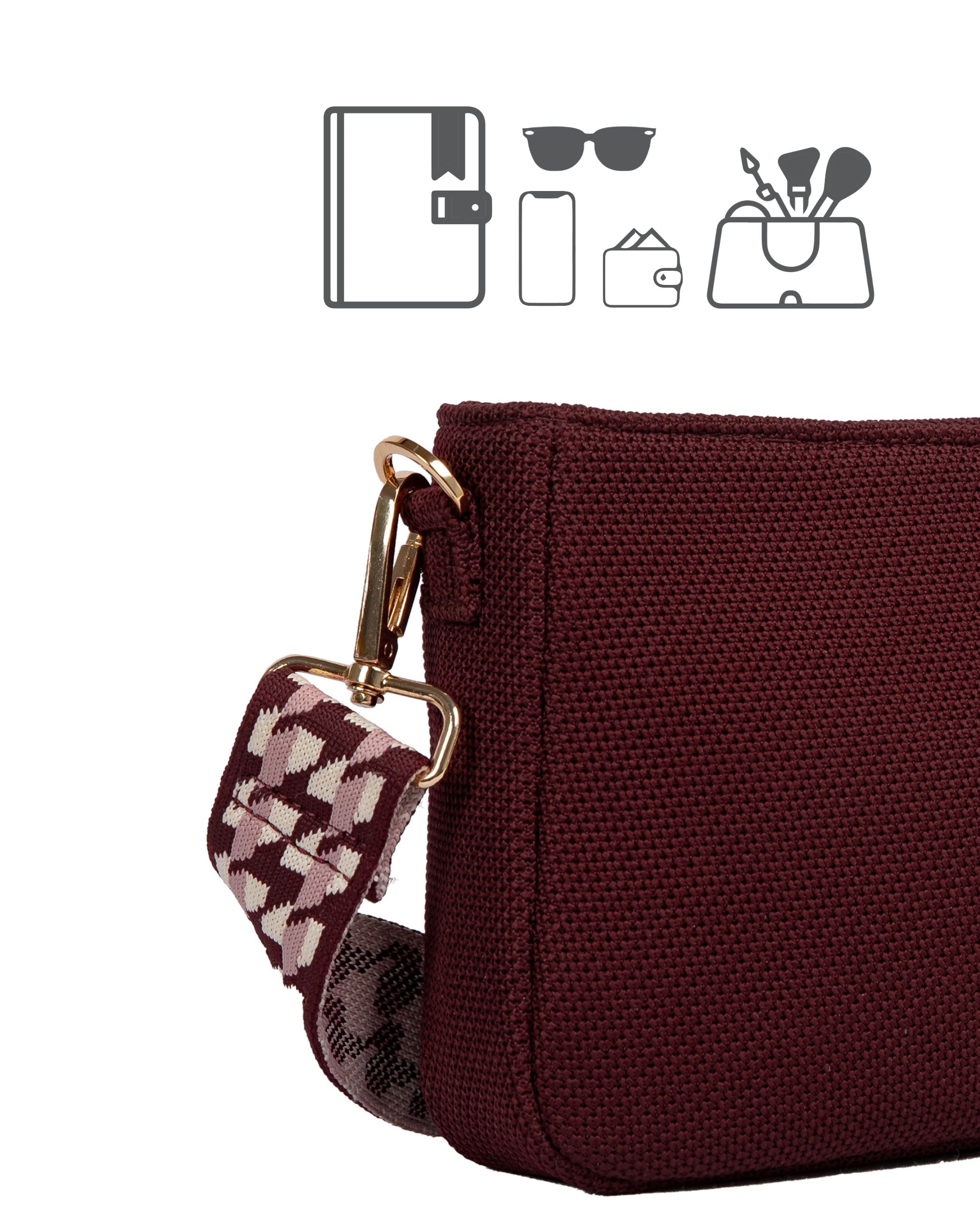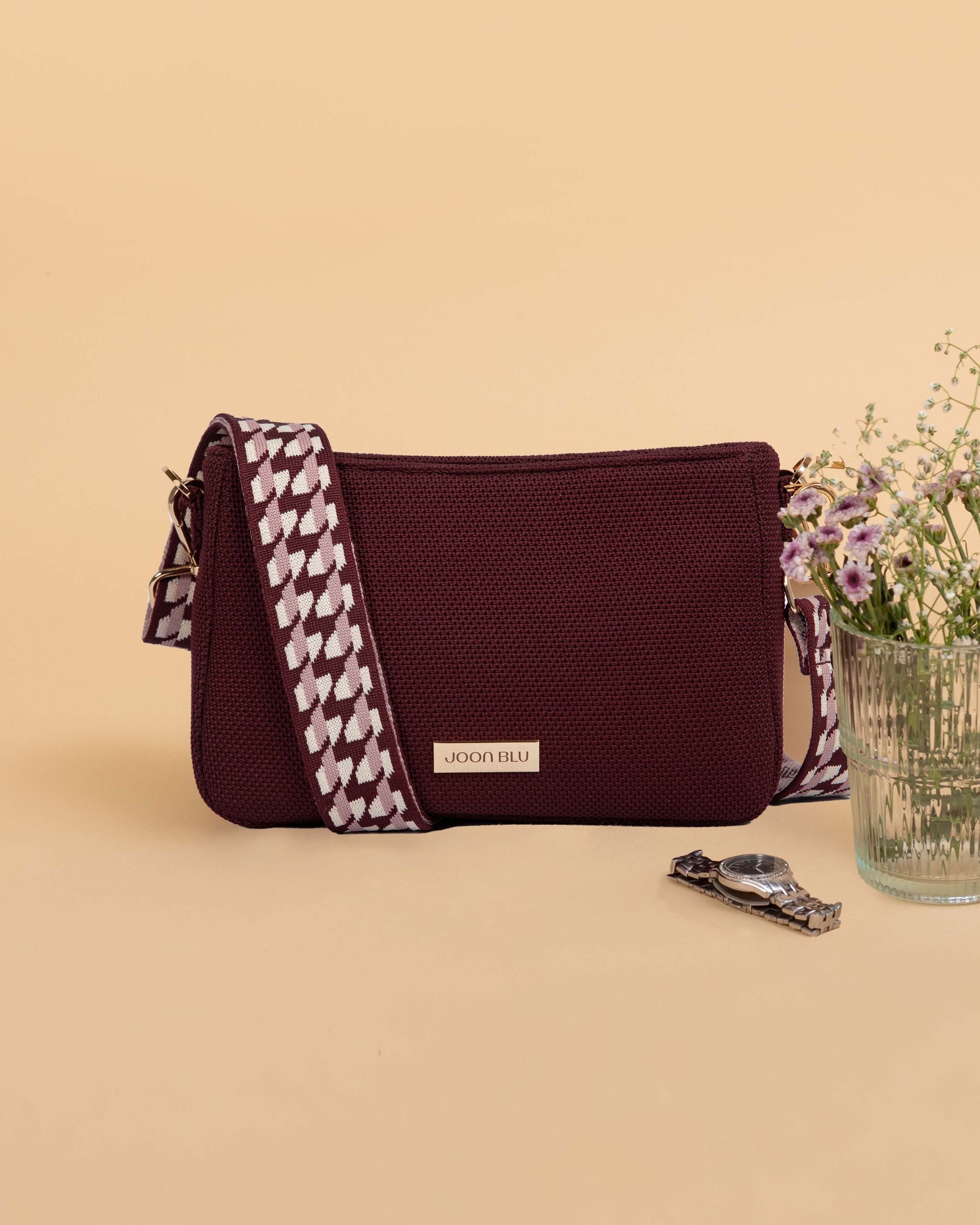 This Melange knit mini sling bag with the Montage pattern belt in maroon, beige and pink makes it a delightful fusion of colours that adds vibrancy and sophistication to any outfit.